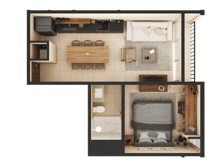 Este proyecto ofrece departamentos de 1 y 2 habitaciones con amplios espacios interiores, cocinas equipadas, balcones y vistas panorámicas.