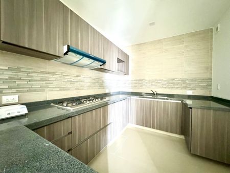Cocina integral en herradura, con parrilla, campana, barra desayunador a y mucho espacio de almacenaje.