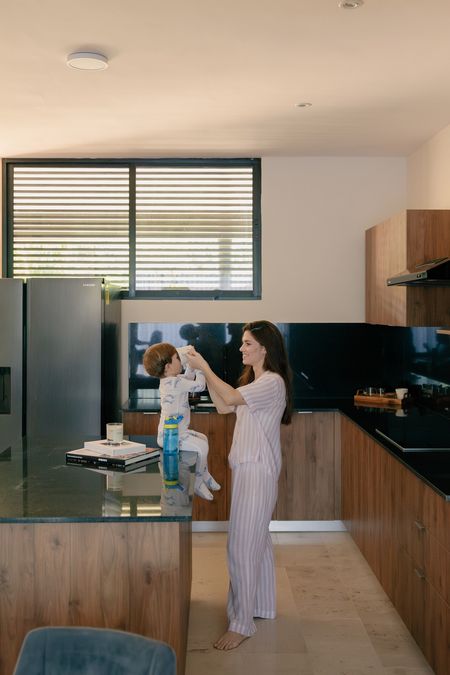 Cocina abierta equipada con barra desayunador, muebles superiores e inferiores, cubierta de granito, parrilla eléctrica, tarja y campana