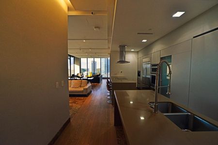 Cocina equipada marca Santos en concepto abierto que conecta con sala, comedor, área de bar con antecomedor. Salida a terraza de 33 m2 con asador de gas.