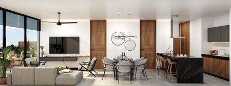 Cocina, sala y comedor.