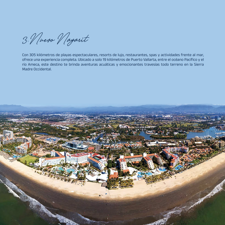 Nuevo Nayarit : Con 305 km de playas espectaculares, resorts de lujo y actividades frente al mar. Este destino se encuentra a 19 km de Puerto Vallarta, entre el océano Pacífico y el río Ameca.