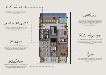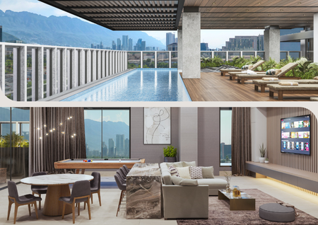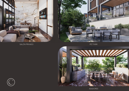 Salón privado, pet park, asadores, sala de estar, salón versátil, terraza, ludoteca, alberca, sala de juegos, gym.