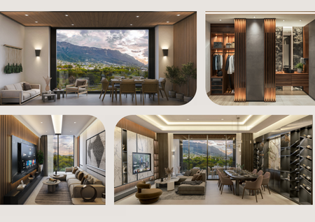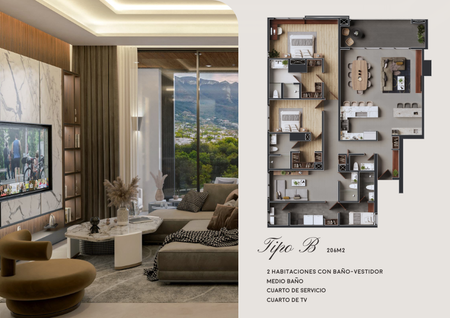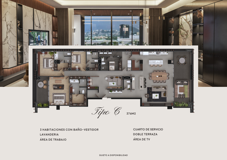 Sala, comedor, cocina lineal con isla, barra desayunadora con vista a la terraza, bar, área de lavado con cuarto de servicio y su baño completo. Medio baño para área social, área de TV, área de trabajo, recámara principal con terraza propia, clóset vestidor y baño, 2 recámaras secundarias con clóset vestidor y baño propio.