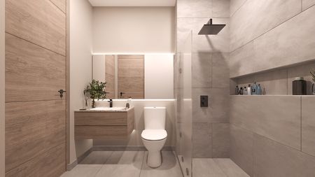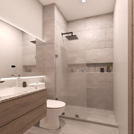 Las cocinas INCLUYEN mesetas forjadas en concreto con cubiertas de granito y mobiliario de encino, creando un ambiente moderno y duradero. Además, la cancelaría de aluminio color bronce con cristal transparente de 6 mm ofrece luminosidad y amplitud, mientras que los pisos y zoclos de cerámico Leighton Sand de 60x60 cm brindan una sensación de continuidad y sofisticación en todo el departamento.