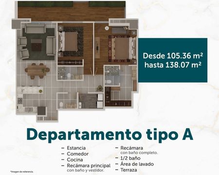 - 105 m², 2 recámaras, 2 ½ baños, cuarto de lavado.