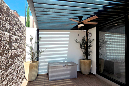Pérgola con techo de vidrio templado en patio trasero