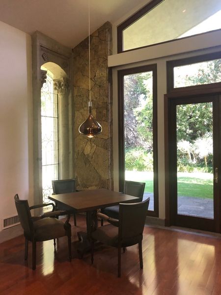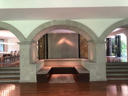 Sala formal enmarcada por arcos de cantera, con dos vitrales transparentes, chimenea enmarcada de cantera ,