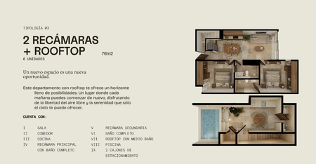2 RECÁMARAS + ROOFTOP: 76 m2 (6 unidades)