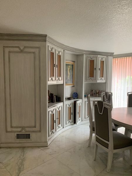 La cocina y antecomedor con grandes espacios para guardar. Cuarto de servicio y área de lavado.