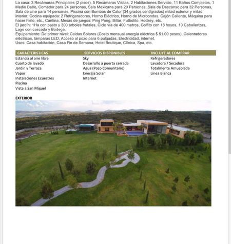 Cuenta con Alberca con bombas de calor 34 grados , 10 caballerizas , Salón de Juegos , Bar , 3 Recamaras Principales de 2 pisos , 5 recamaras para Visitas , 2 Habitaciones de Servicio.