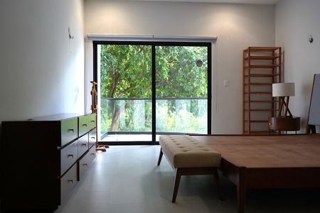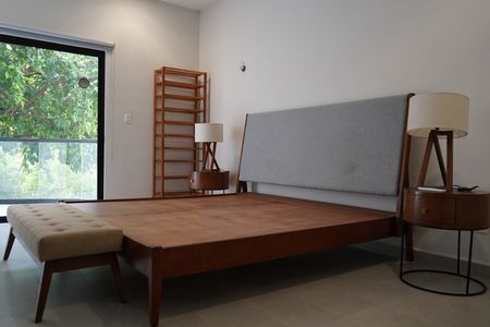 - Recámara principal: base para cama king, cabecera, burós, cajonera, balcón, amplio clóset vestidor climatizado y baño completo