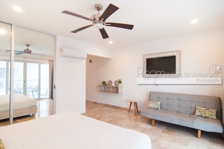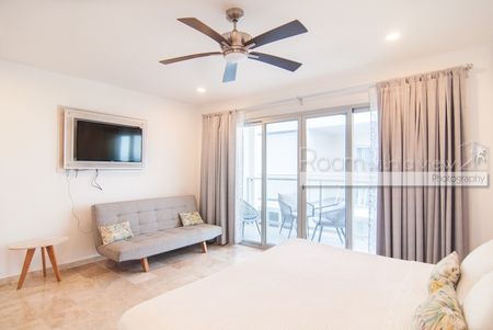 Ideal para solteros o parejas, este estudio lleno de luz solar es perfecto para rentas vacacionales o como su propio refugio caribeño. Cuenta con una cocina con barra de desayuno, microondas y cocina eléctrica. Este estudio tiene una zona de estar con un futón y una zona de descanso con una cama king-size, dos mesitas de noche incorporadas y un armario con puertas con espejo. Se abre a un balcón privado con vistas a la calle. Este condominio tiene pisos de cerámica y acabados de alta calidad que son duraderos y fáciles de mantener. Se ofrece amueblado y equipado con ventiladores de techo y aire acondicionado.