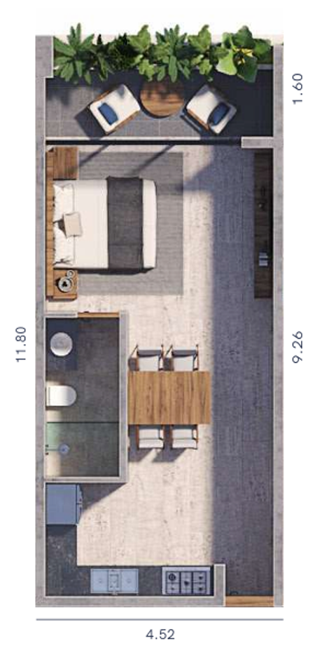 (Incluye sala, cocina, recámara, baño completo y terraza).