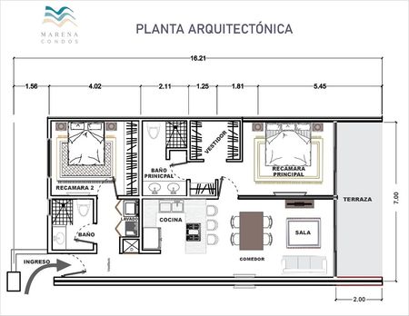 Todas las unidades en MARENA son de dos recámaras, dos baños, un diseño y acabados de lujo, pisos en mármol, todas las unidades con un amplia terraza de 20.79 mts.