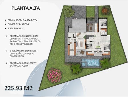 • Equipamiento: Carpinterías en closets, cancelería en baños, mosquiteros, carpintería completa en cocina, puertas reforzadas de carpintería, jardín y sistema de riego automático, piscina con preparación para filtro, área de bar, boiler, presurizador, tanque estacionario, estufa, campana y tarja, puertas en pasillos laterales, preparación para instalación paneles.
