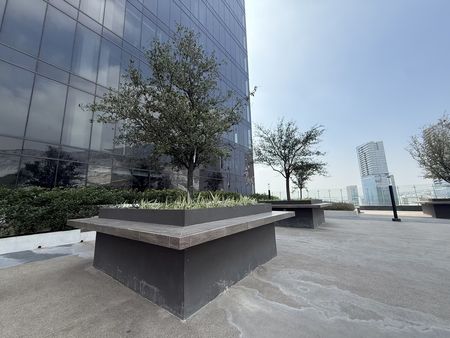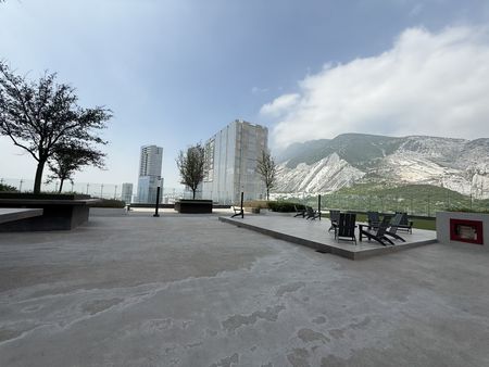 Beneficios del Edificio: Diseño moderno y corporativo, Ubicación estratégica en San Pedro Garza García, Seguridad 24/7, Áreas comunes de alto nivel, Business center y amenidades para ejecutivos.