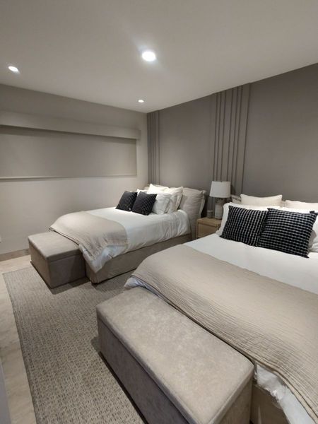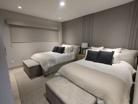 El departamento tiene tres recámaras, cada una con su propio baño, la recamara principal equipada con cama King Size, la recamara secundaria 1 con dos camas Queen Size , la recamara secundaria 2 con dos camas matrimoniales, y un medio baño para las visitas, para que tengas toda la intimidad y el confort que necesitas.