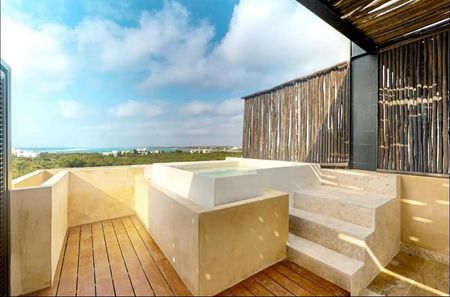 Hospédate en un penthouse studio con vista directa al mar y jacuzzi privado en Bahía Tankah, Tulum, con una tarifa mensual muy por debajo del mercado y más accesible que la mayoría de opciones similares en la Riviera Maya.
