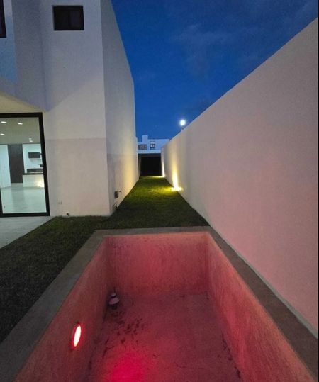 - Terraza, jardín y piscina con iluminación en la parte trasera.