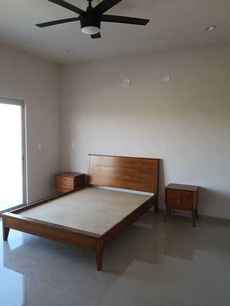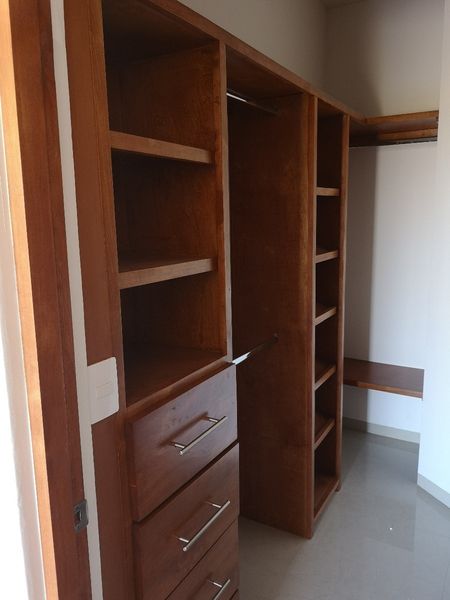 Un condominio muestra terminado, con cocina integral, muebles de baño, abanicos de techo, muebles de recámara y clósets de madera fina.