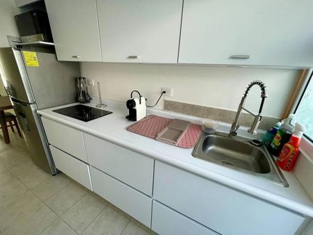 Cocina equipada con estufa de inducción, refrigerador, microondas, utensilios, trastes, licuadora y cafetera Nespresso