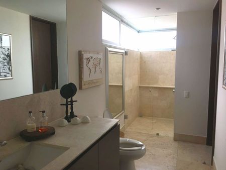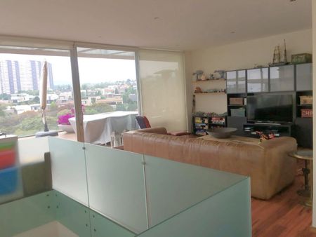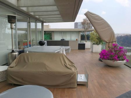 Renta PH en Cumbres de Santa Fe de 440m2, de dos pisos, en el superior esta la recamara principal con baño y vestidor, family y Roof Garden muy amplio de 63 mts, ademas de terraza grande en la planta de abajo que da a sala y comedor, 3 recamaras, despacho o 4a recamara con baño completo, 4 baños, baño de visitas, desayunador, cuarto de servicio, area de lavado, 4 estacionamientos
