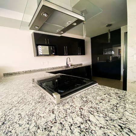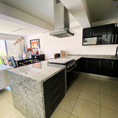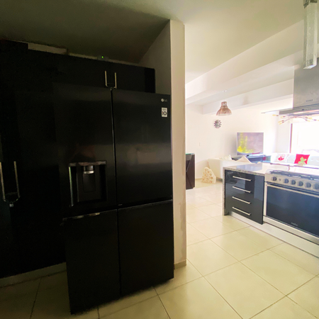 Encontrarás en PB Amplia cocina con barra de granito, Bancos de madera color café, y campana de techo, amplio Refrigerador LG y Lavadora LG en excelente estado.