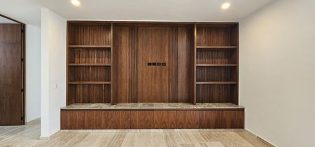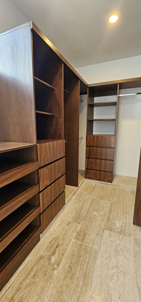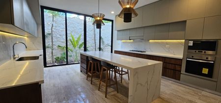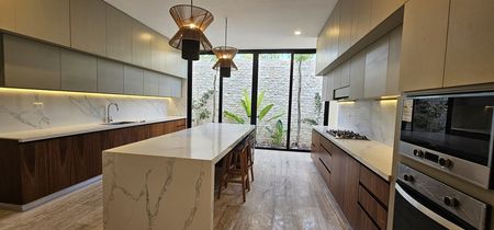 Cocina equipada (carpintería inferior y superior, mesetas de cuarzo, horno, parrilla y campana)