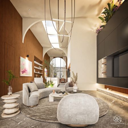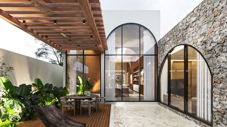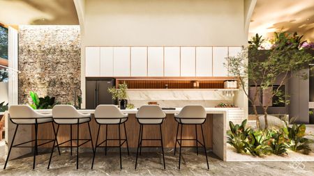 La residencia de diferencia de las demás por un diseño arquitectónico contemporáneo con toques mediterráneos, se distingue por su estilo de Wabi Sabi con dobles alturas, pronunciadas curvas acabados en Chukum, piedra natural y amplias jardineras que dan vida y un estilo único a la fachada e interiores, además de ser un Smart home controlada desde la app de tu teléfono, sus dobles alturas le dan mucha amplitud a los espacios.