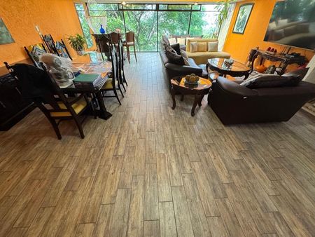 • Estancia y comedor con ventanales de piso a techo que integran la vista hacia el jardín.
