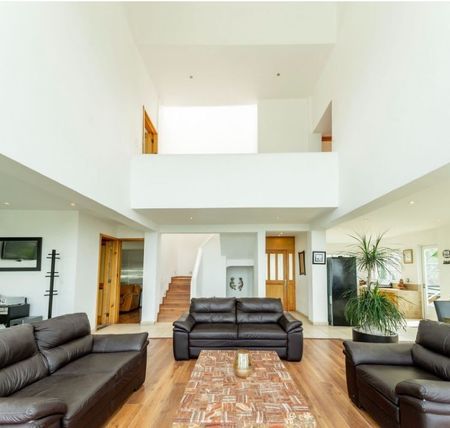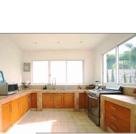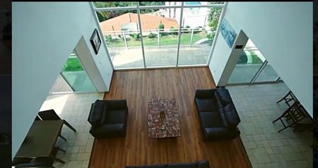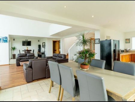 Sala con techo de doble altura y ventanal central, comedor, desayunador con terraza,cocina equipada, cochera para 3 autos exterior y 5 autos techados, cuarto de servicio.