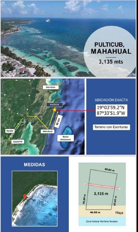 El terreno cuenta con una superficie de 3,135 m² y se ubica en la playa de Mahahual, específicamente en Playa Chinchorro, una zona reconocida por su arrecife de coral que forma parte de la Reserva de Arrecifes de México, la segunda más grande del mundo. Este entorno natural atrae a buzos y científicos de diversas partes del mundo. Mahahual es también un puerto que recibe cruceros internacionales debido a la belleza de sus playas, y próximamente quedará muy cerca de dos estaciones del Tren Maya. La propiedad ofrece la posibilidad de fraccionar y lotificar, lo que la convierte en una excelente oportunidad de desarrollo.