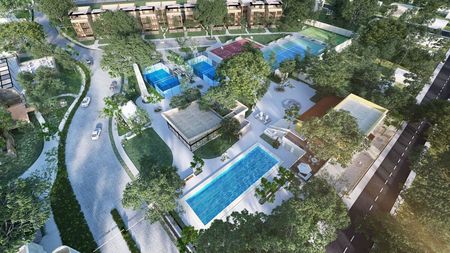 - Área Wellness: dos canchas de paddle, cancha de tenis, básquetbol, futbol 5, cuarto de vapor, gimnasio climatizado, alberca semiolímpica, mirador / solarium / yoga.