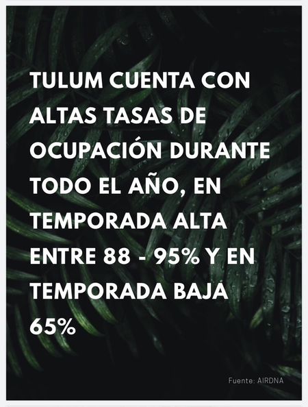 Tulum cuenta con Altas tasas de ocupación durante todo el año, en temporada alta entre el 88% y el 95%, y en temporada baja del 65%, lo cual hace de tu inversión de una rentabilidad sin igual.