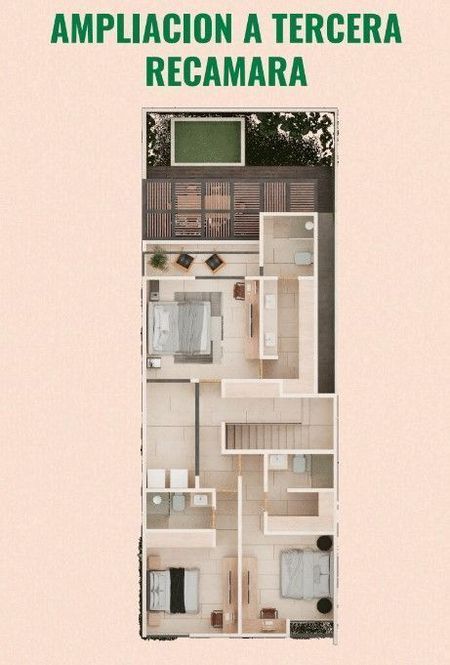 -Recámara 2 con espacio para dos camas individuales y área de estudio con área de clóset vestidor(No incluye carpintería)y baño completo.