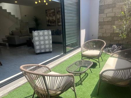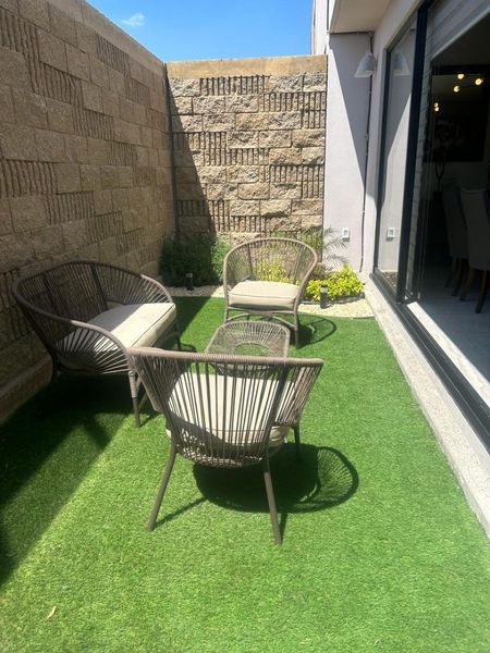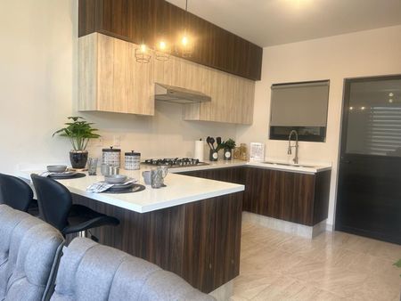 En planta baja tiene sala, comedor, cocina, jardin posterior, area de servicio, closet de blancos, medio baño y estacionamiento para 2 autos.