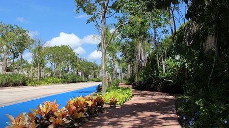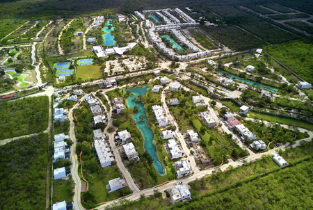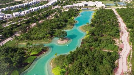 Caseta de vigilancia, parque central, lago artificial y área de juegos infantiles.