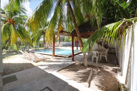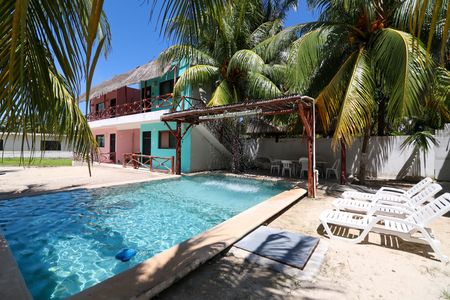 Alberca de 4 x 7 con cascada y pérgola tipo Bajareque.
