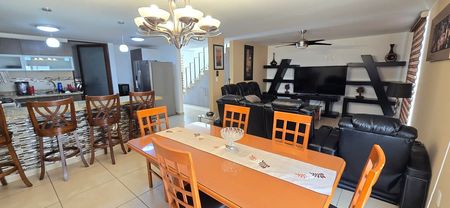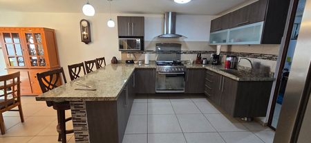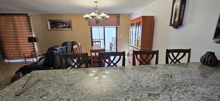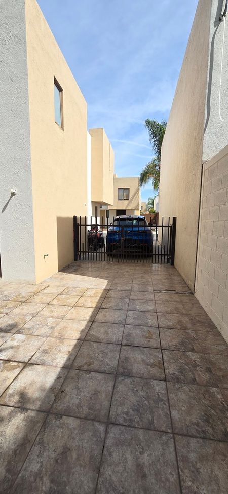 Estacionamiento hasta para 3 autos en pila / área de patio trasero en L con reja / medio baño de visitas / Cocina equipada con barra de granito y mueble extra de alacena / cuarto de lavado / Sala / Comedor.