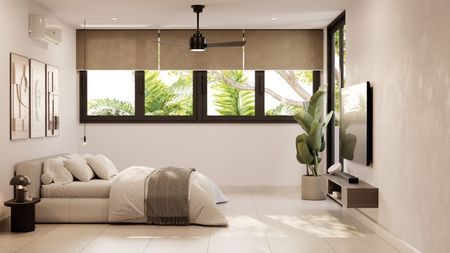 Recámara principal con baño con doble lavabo, closet vestidor y balcón