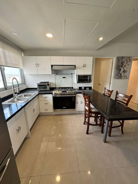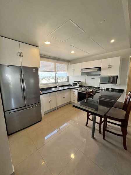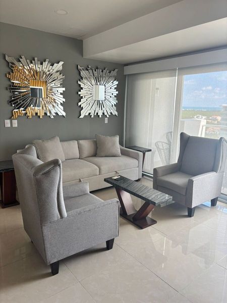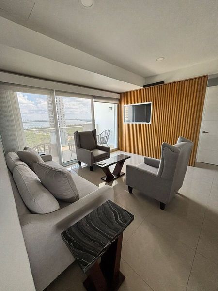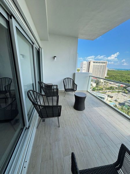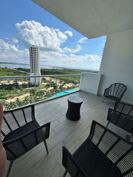 El departamento cuenta con una amplia Terraza con vista espectacular al mar y a la laguna Nichupté desde un 8to piso con acceso directo a Plaza comercial Las Américas.