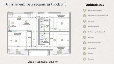• Recámara King Size (Lock Off): Flexibilidad para maximizar tu rentabilidad o disfrutar de amplios espacios privados.