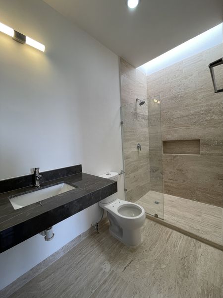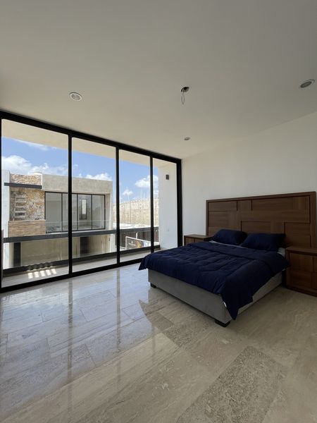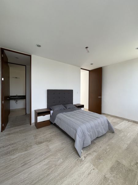 Recámara principal con espacio de closet vestidor, baño completo con doble lavamanos y balcón