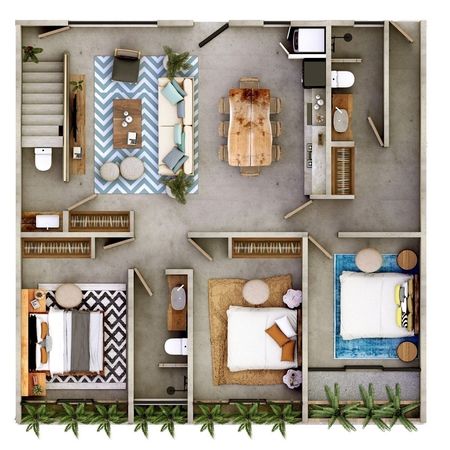 These new 1- and 2-bedroom condos and penthouses offer different layouts and options to suit your needs, including lock-off options for additional occupancy and earning potential. You’ll be able to choose from ground floor units with a mezzanine bedroom and double height ceilings, first floor units with private balconies, or spacious second floor units with private balconies and rooftops with plunge pools. These condos have polished concrete floors and high-quality natural finishes that are durable and easy to maintain. They are being offered for sale unfurnished but equipped with air conditioning.