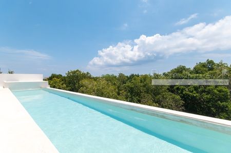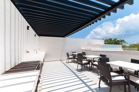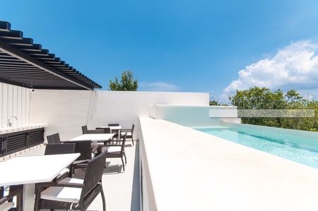 Este penthouse de 2 habitaciones y 2 baños tiene todo lo que podría desear en una propiedad vacacional. Ofrece un amplio diseño de planta abierta con cocina totalmente equipada con isla y una luminosa sala de estar y comedor. La terraza lateral cuenta con dos persianas de piso a techo instaladas para ofrecer privacidad y protección solar. La habitación principal tiene un lujoso baño en suite y un balcón privado. Una escalera conduce a la terraza privada en el rooftop con jacuzzi, pérgola, barra y sombra que cubren al menos un tercio de toda el área del rooftop sobre la puerta y el jacuzzi. Este departamento cuenta con pisos de cerámica y acabados de alta calidad que son duraderos y fáciles de mantener. Se ofrece en venta completamente amueblado y equipado con todas las amenidades prácticas que esperarías, incluyendo ventiladores de techo, aire acondicionado, lavadora y secadora, iluminación LED, cubiertas para ventanas y seis paneles solares para energía verde.